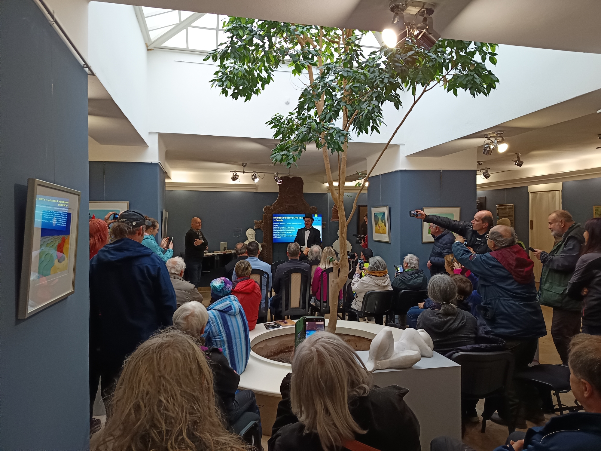 Semilské muzeum nám zpřístupnilo všechny městské expozice, přičemž expozice Léčitelé Pojizeří a Podkrkonoší a kostel sv. Petra a Pavla s možností výstupu na vyhlídkovou věž jsou obvykle mimo sezonu uzavřené, a to za zvýhodněnou cenu tří vstupů za jedno vstupné. Připravili také speciální komentované (nebo spíš hrané) prohlídky s F. L. Riegrem a jeho neteří Bohuslavou Hančovou v podání Jaroslava Vávry, tímto emeritního řídícího místní základní školy a Pěveckého spolku Jizeran, v doprovodu dcery Jany Vávrové. A kromě toho připravili prostory galerie pro slavnostní zahájení roku Palackého, který jsme odstartovali po desáté hodině.